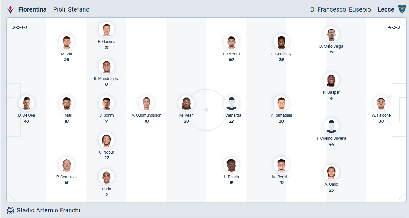 Fiorentina đứng thứ 6 mùa trước, vị trí rất ổn với đội bóng này. Họ hướng đến mùa giải 2025/2026 với thành tích cao hơn nữa nhưng mọi thứ đang đi ngược lại với suy nghĩ của thầy trò HLV Stefano Pioli, Fiorentina chưa thắng trận nào trong 9 vòng đấu đã qua và đứng thứ 19/20 đội. Từ vị trí dự cup châu Âu giờ đây họ có nguy cơ xuống hạng nếu không chơi tốt hơn ở các trận đấu sắp tới, chính vì vậy Fiorentina rất cần chiến thắng ở vòng đấu thứ 10 này. Chỉ phải đón tiếp Lecce là cơ hội tốt để Fiorentina có chiến thắng đầu tiên và khả năng họ sẽ có được điều mình cần.