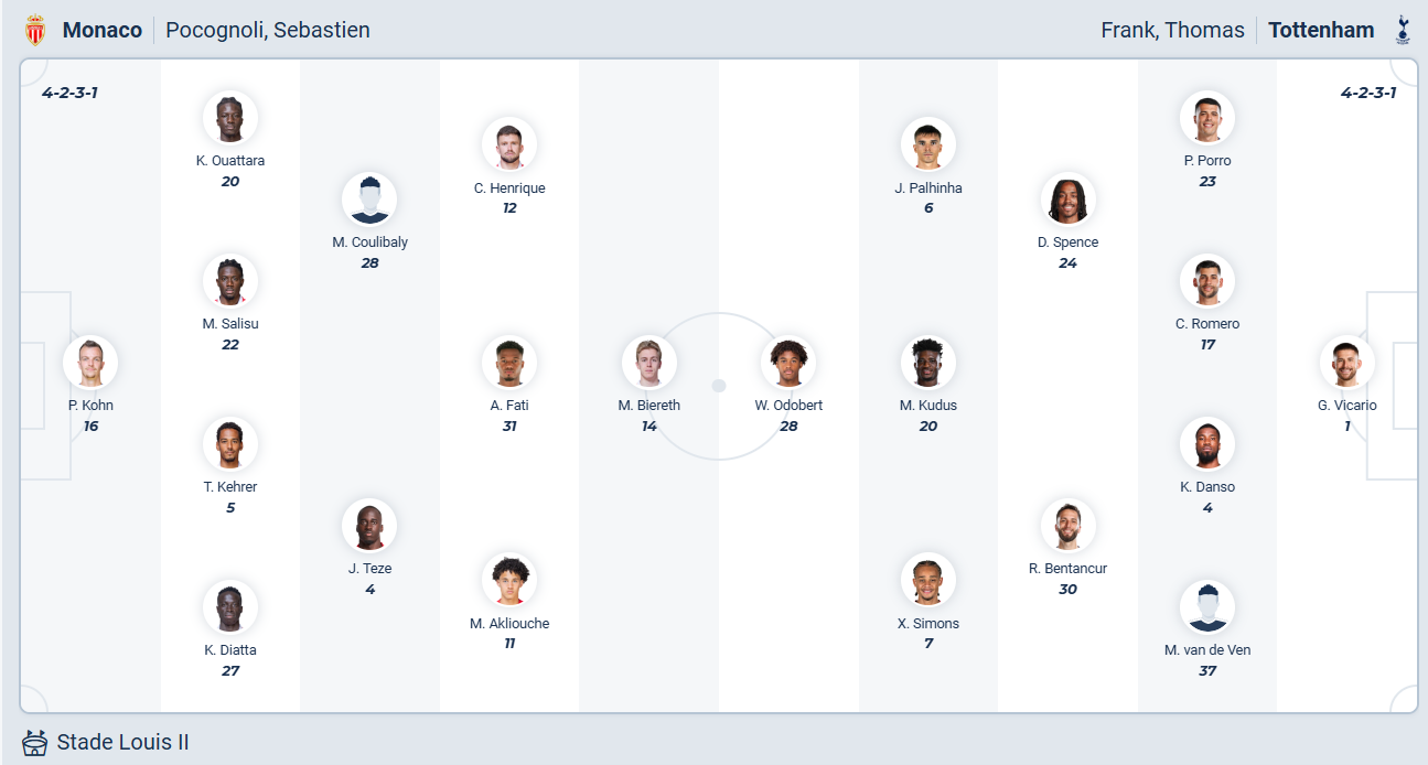 Monaco sẽ tiếp đón Tottenham trên sân nhà ở lượt trận thứ 3 League Phase Champions League với mục tiêu giành chiến thắng để có thứ hạng tốt hơn trên bảng xếp hạng. Đây không phải điều dễ thực hiện bởi đối thủ không phải đội bóng dễ chơi.